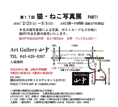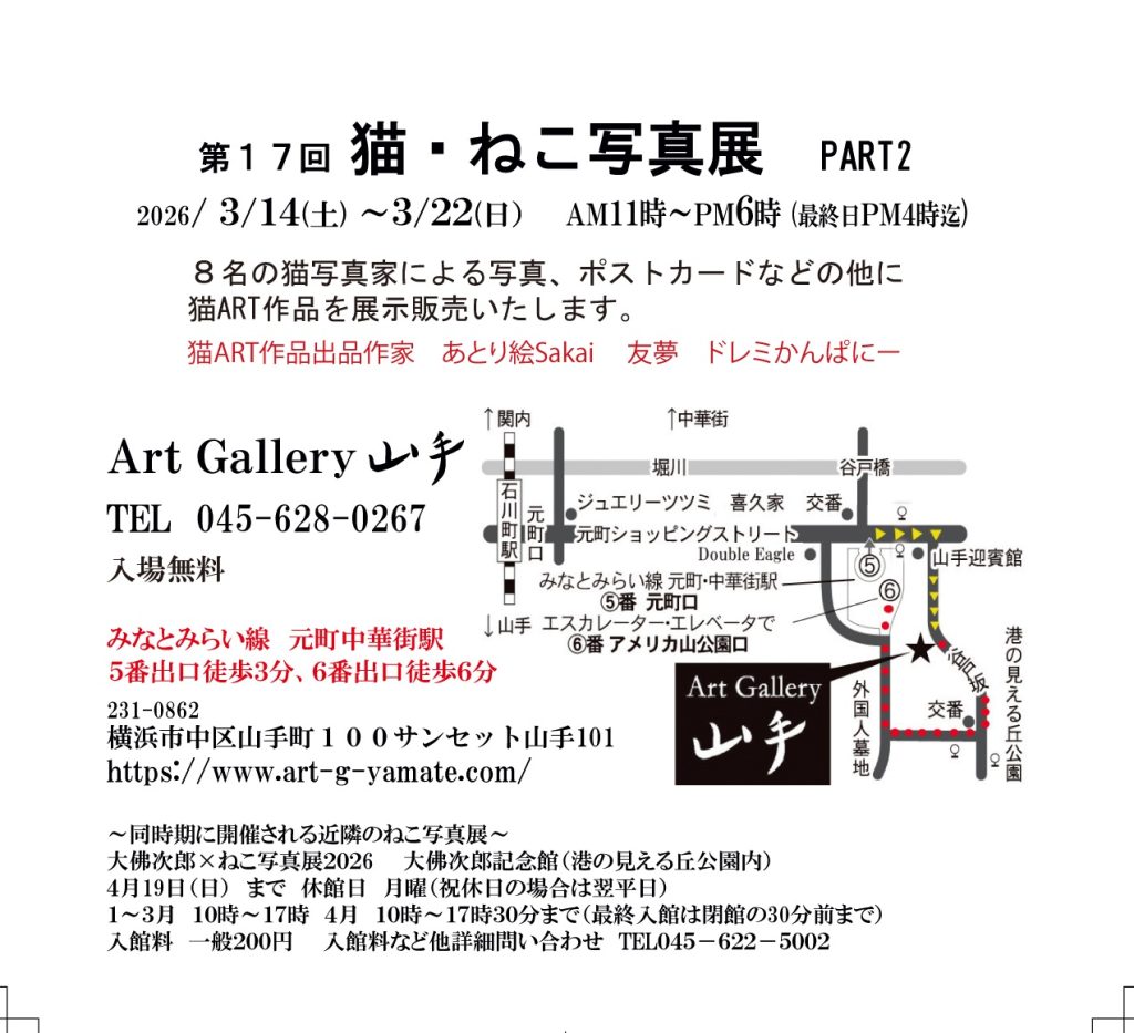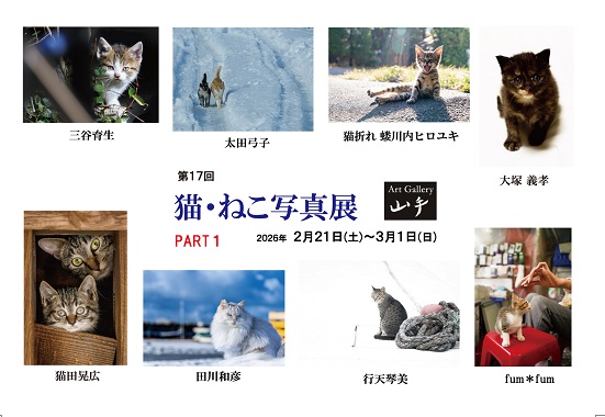 第17回 猫・ねこ写真展 展覧会情報 2026.02.13 2025.12.27 2026年2月21日~3月1日 PART1AM11時~PM6時(最終日はPM4時まで) 2026年3月14日~3月22日 PART2AM11時~PM6時(最終日はPM4時まで)